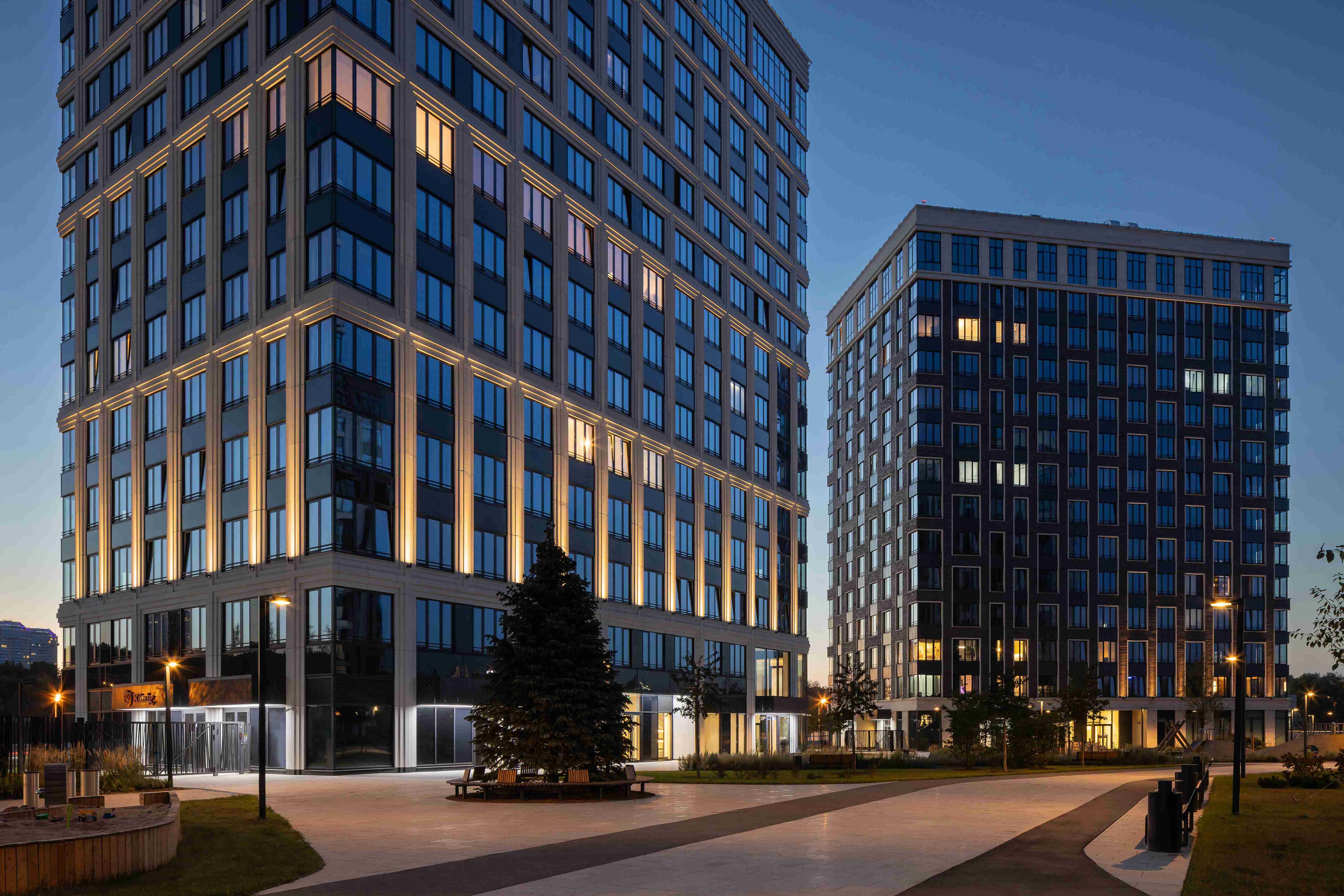 Дома интересно рассматривать, потому что с каждого ракурса West Garden раскрывается по-новому. В тёмное время суток клубные дома преображаются благодаря элегантной архитектурной подсветке.