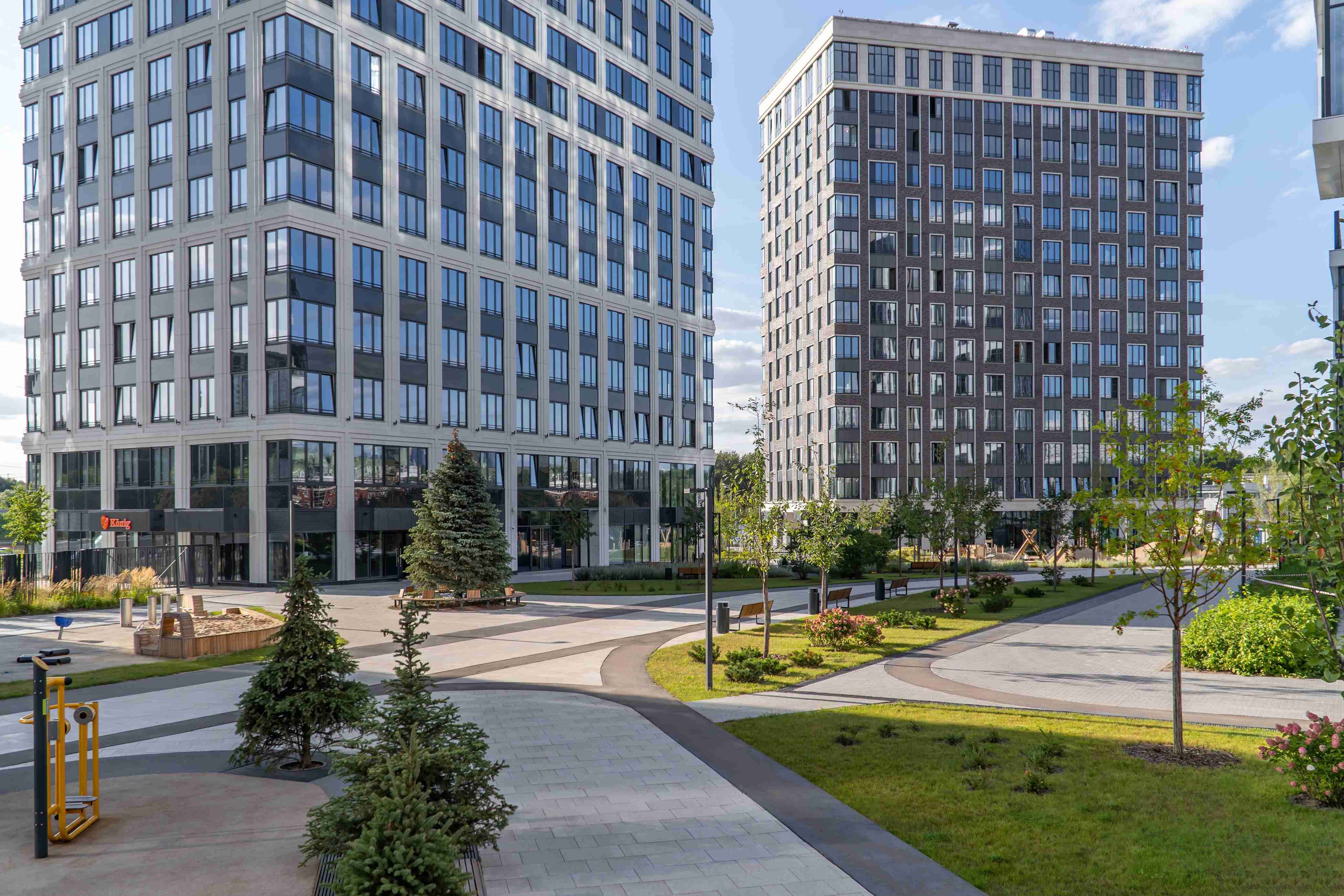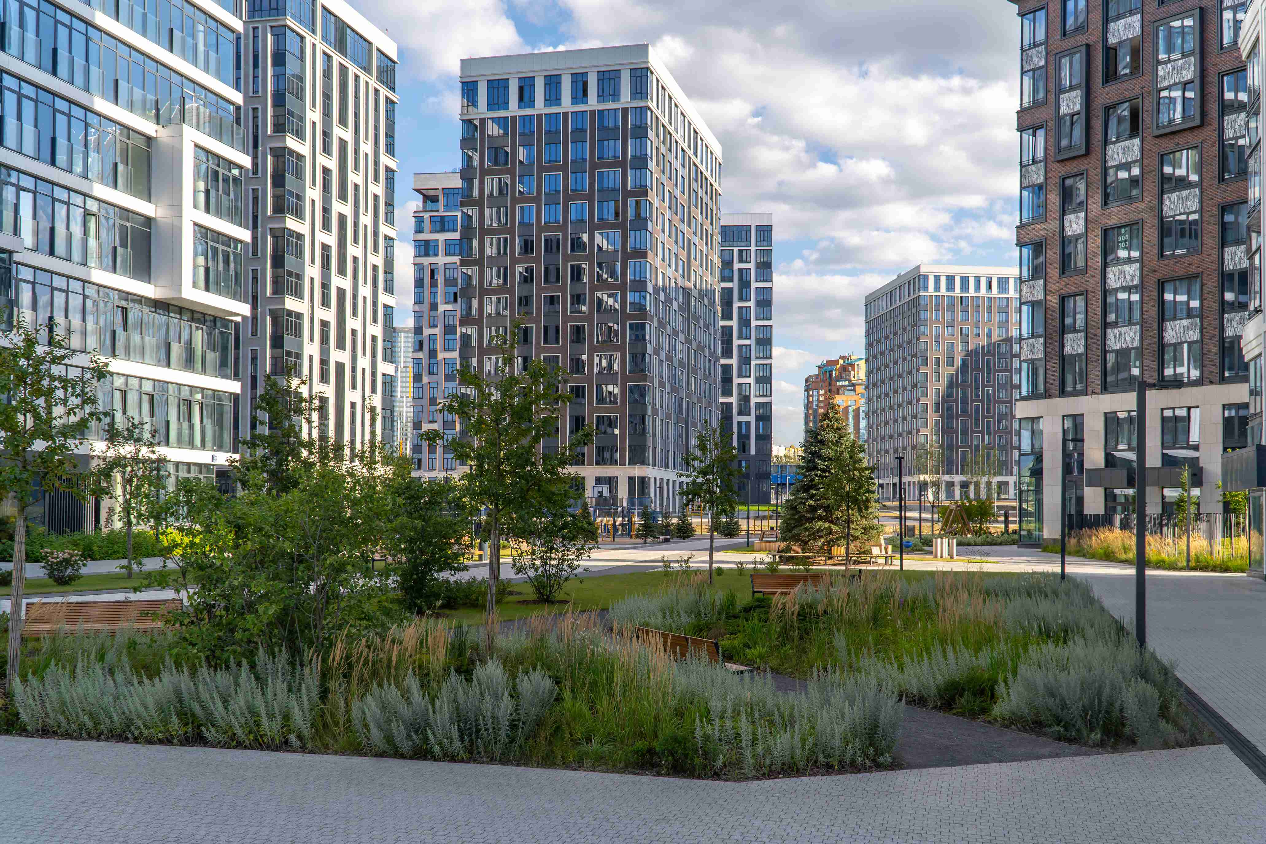 Дома расположены на комфортном расстоянии друг от друга, благодаря этому в квартирах будет много естественного света и прекрасные виды из окон.